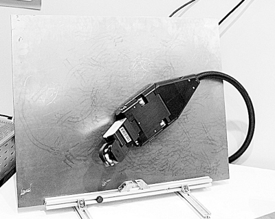 在展臺上,記者看到一個像壁虎一樣吸附在鐵板上爬行的機(jī)器,不禁問道:它能干什么?